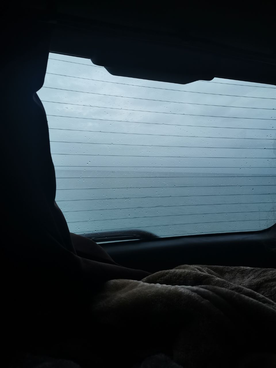 Je me réveille à 5h du matin pour une pause pipi. La mer est haute et la pleine lune aussi. Je regarde la mer avec la lumière de la lune et les vagues. Un grand rocher se dresse.
