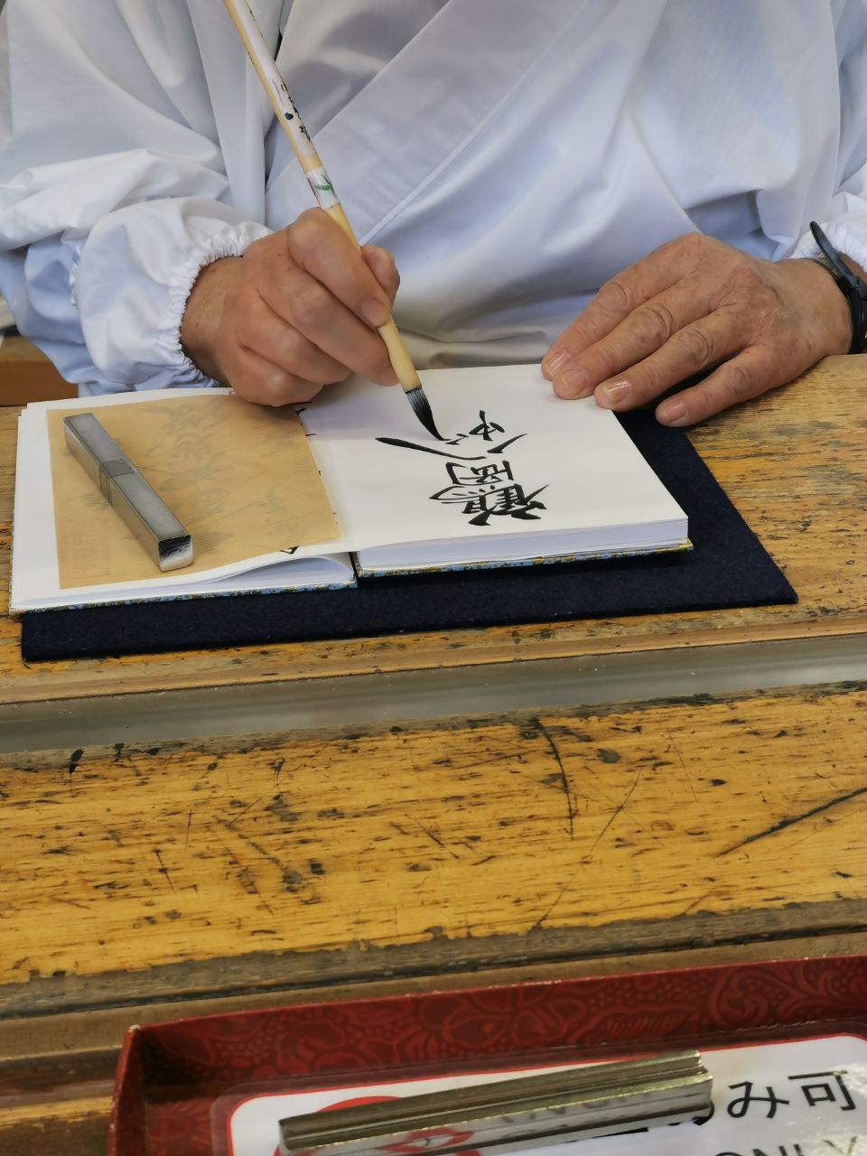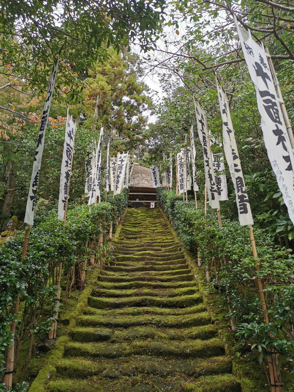 On visite ensuite un dernier temple à côté, bien moins connu. Encore un goshuin, puis avant de monter les marches, on croise un moine qui enlève les feuilles de la jolie mousse d’un vieil escalier, à qui on dit bonjour. Dans l’escalier je me retourne pour l’observer utiliser son smartphone, c’est drôle, ce mélange entre modernité et tradition que l’on retrouve partout.